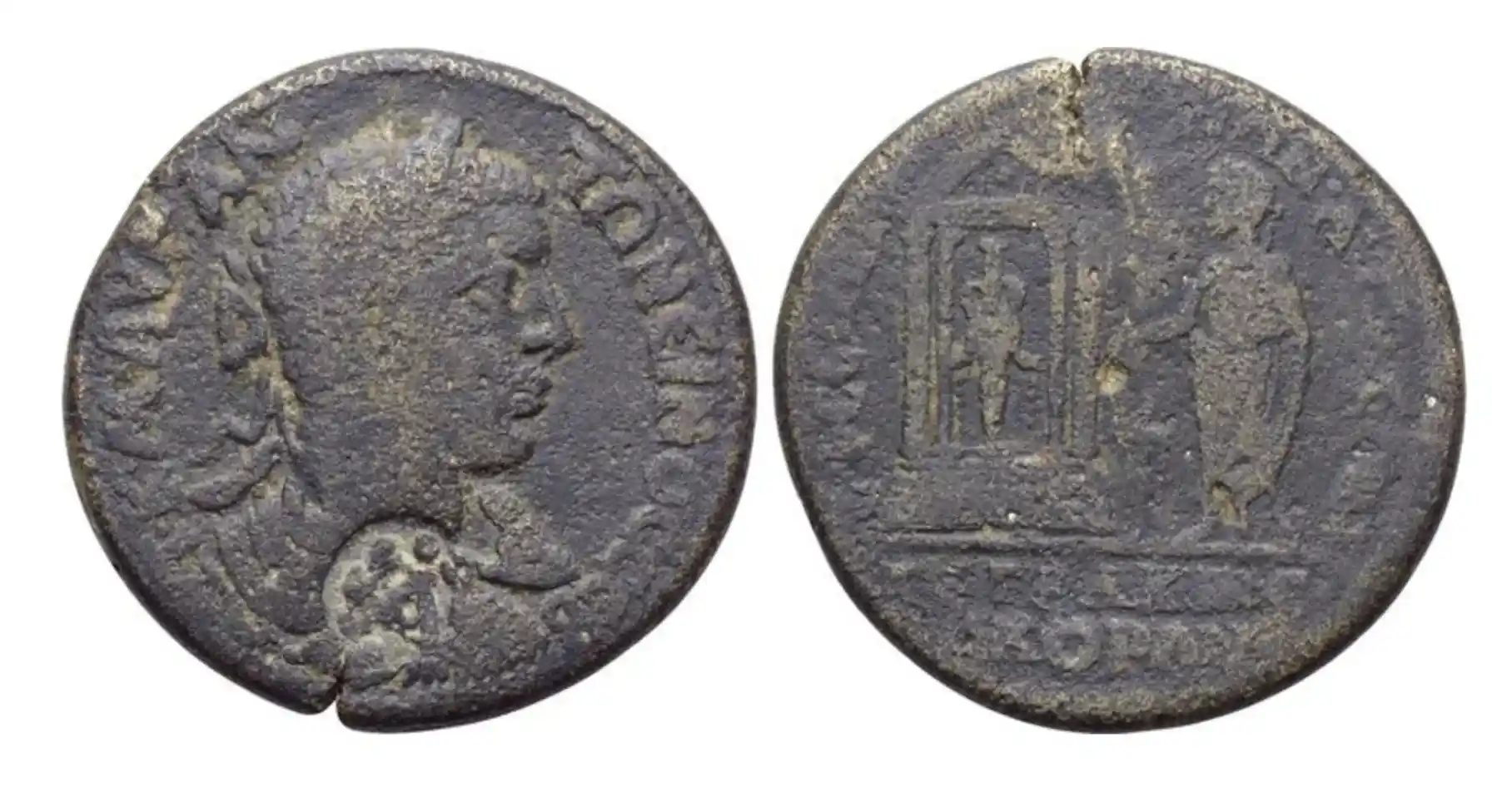 The presence of Elagabalus on the reverse suggests a “sending honours to Artemis at a distance.” As further acknowledgements of gratitude towards the emperor, he is depicted as tall as the temple (symbolic, in art, of quasi-divine status) and performing a sacrifice (a physical manifestation of piety). Such praise does indeed emphasise how much the honour meant to Ephesus, but unfortunately her faith in Elagabalus was ill-founded: the emperor ruled for just four years, after which he and all associated cults were to be forgotten. The title was consequently soon retracted (i.e. Ephesus became ‘thrice neokoros’ once more) and the mention of ‘neokoros’, now a humiliating reminder, slowly faded from coinage.