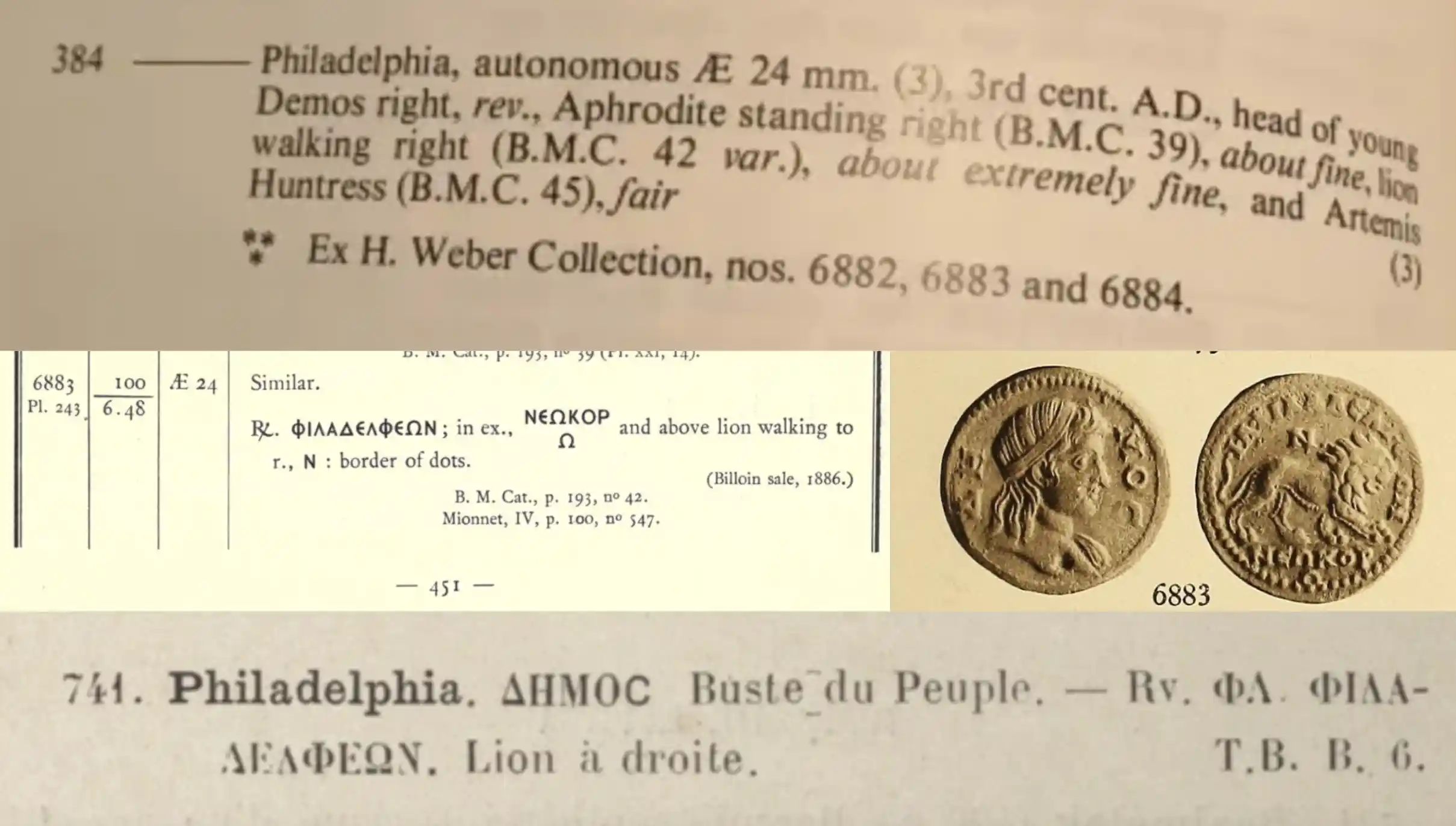On the eBay description of this piece, it was noted the coin had appeared as part of lot 384 in Sotheby’s Brand Sale, part 7, 1984. Virgil M. Brand (1861/2-1926) was an American collector with a massive varied collection of 368,000 coins (some of which were especially desirable). I asked if anyone had access to this catalogue on an online forum, and one member kindly replied with some photos of the lot’s listing. Lot 384 included three coins from the same city (Philadelphia in Lydia), and this one was described as “lion walking right (B.M.C 42 var.), about extremely fine." Unfortunately, without photos of these in the catalogue, I couldn’t verify this was the same coin. The listing did explain, however, that the coin used to be no. 6883 of the H. Weber collection.