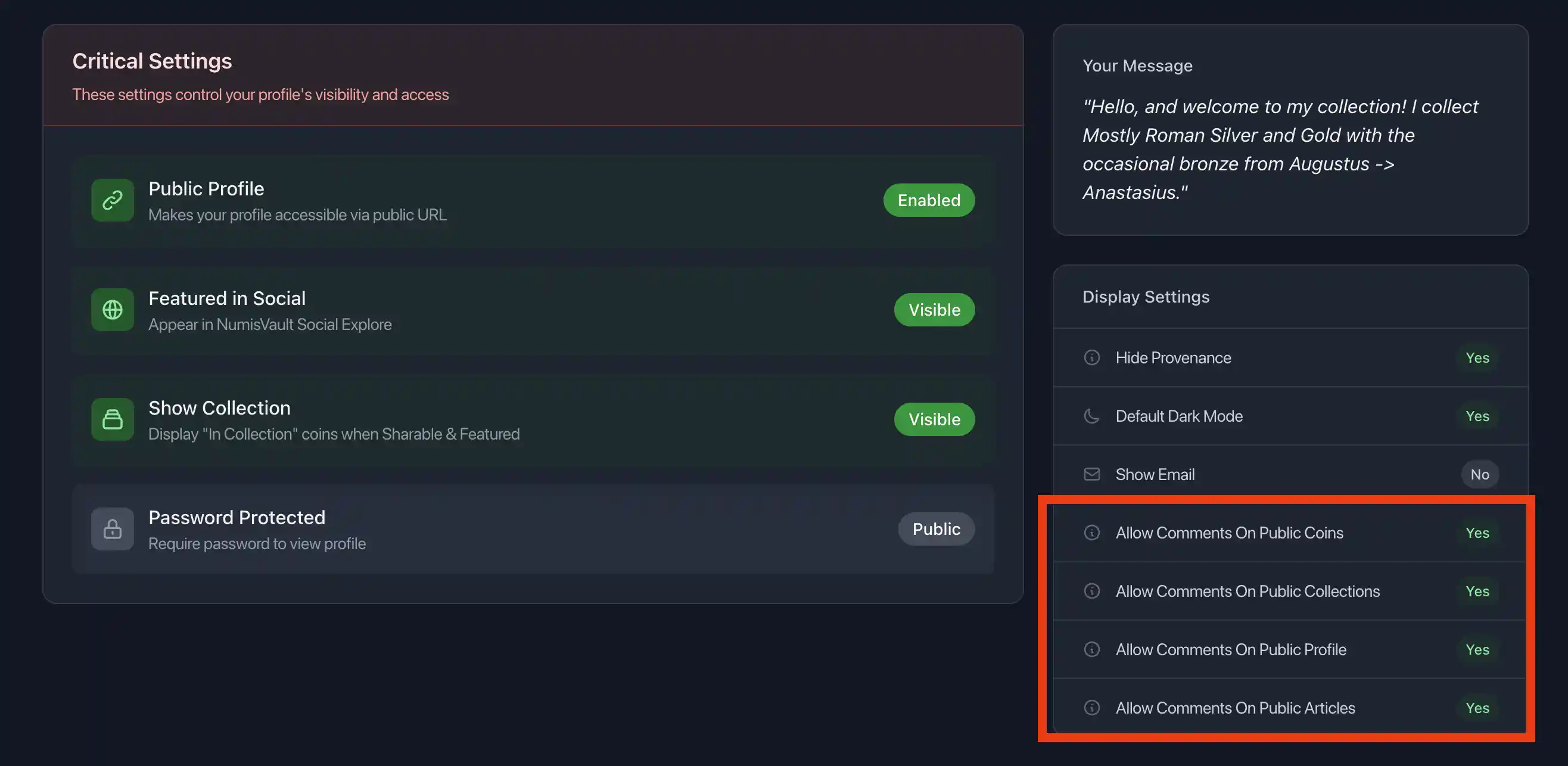 You can ⛔️ OPT-OUT of each "type" ( ⛔️Coins, ⛔️Articles, ⛔️Collections, ⛔️Profile) of commenting on YOUR STUFF in Public Profile Settings (SEE ATTACHED SCREENSHOT IF YOU DO NOT WANT TO GET ANY COMMENTS ON YOUR STUFF!)