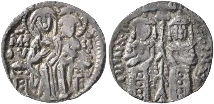 DOC 1195 Above, The Virgin enthroned facing, nimbate, wearing pallium and maphorium, holding on her left rm the infant Christ, nimbate/ John V, on the left, standing facing, wearing loros, placing his right hand on his chest, and John VI, on the right, standing facing, wearing loros, placing his left hand on his chest, holding long cross between them.
