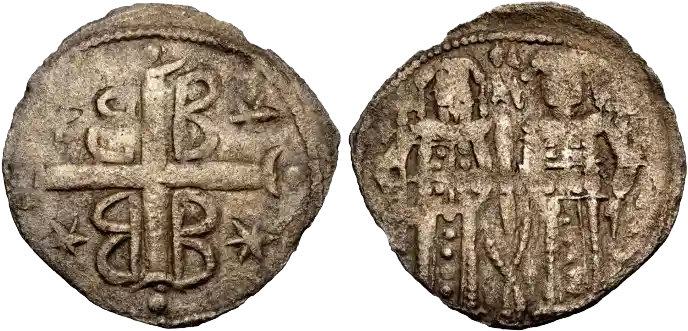 DOC 1197 Above, Obverse: Long cross, with four B's and four stars in quarters / Three-quarter-length figures of the two emperors standing facing, to left, holding scepter, to right, holding labarum or akakia between them.