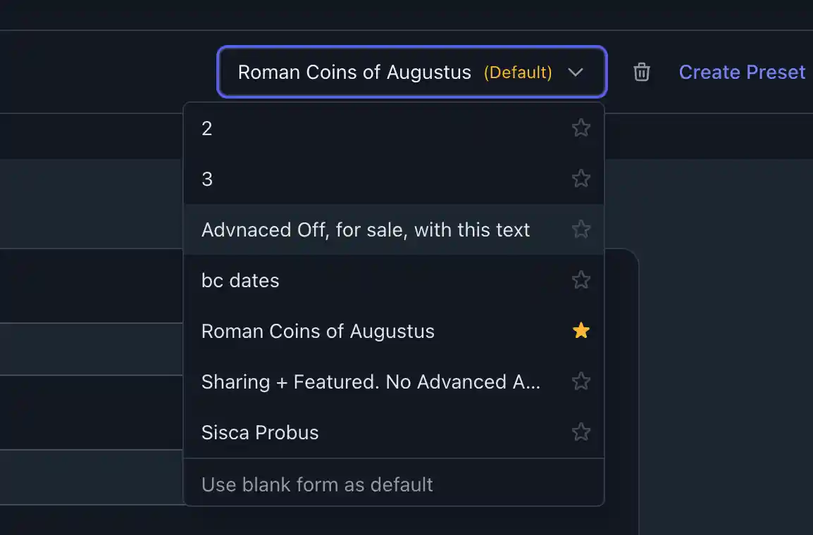 Automatically sets Advanced Ancients for all coins: Civilization, Period, Authority, and Denomination where possible