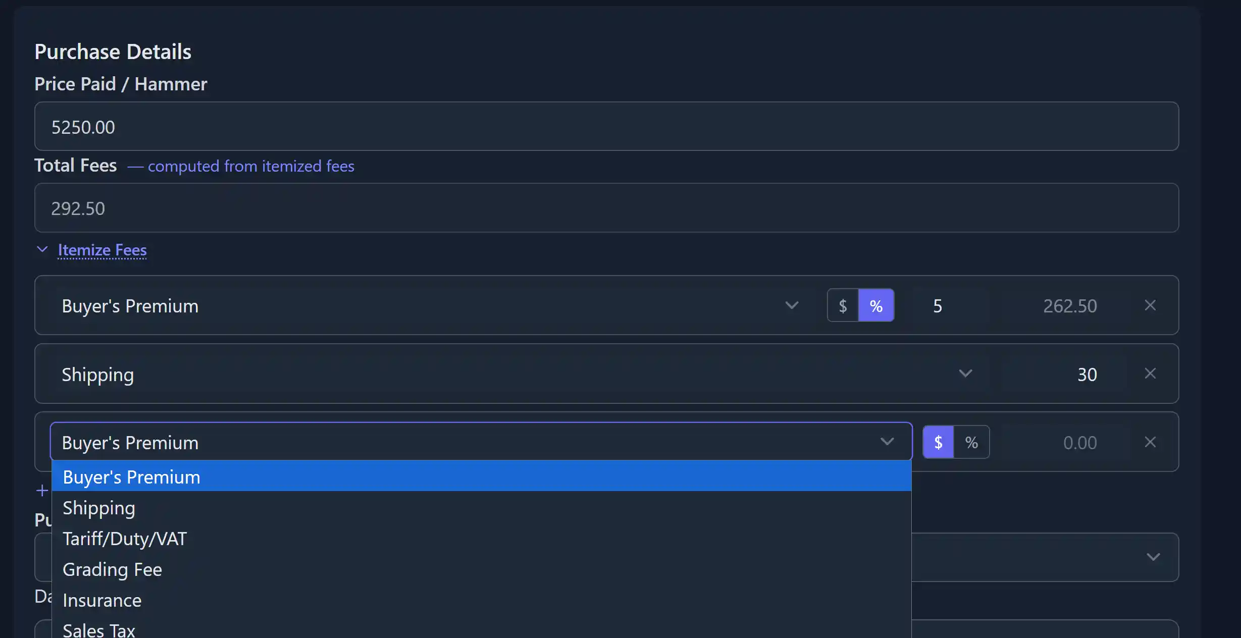 Backwards Compatible | TRACK & ITEMIZE BUYERS/SELLERS FEES All previous "purchase_fees" are now "Total Fees". If you dont want to itemize fees , you can still input a total fees. HOWEVER, if you want granularity, and want to itemize your fees, and tracked itemized fees... you CAN NOW! Total fees can now be a COMPUTED value, summing all itemized fees Track Individual Buyers Fees