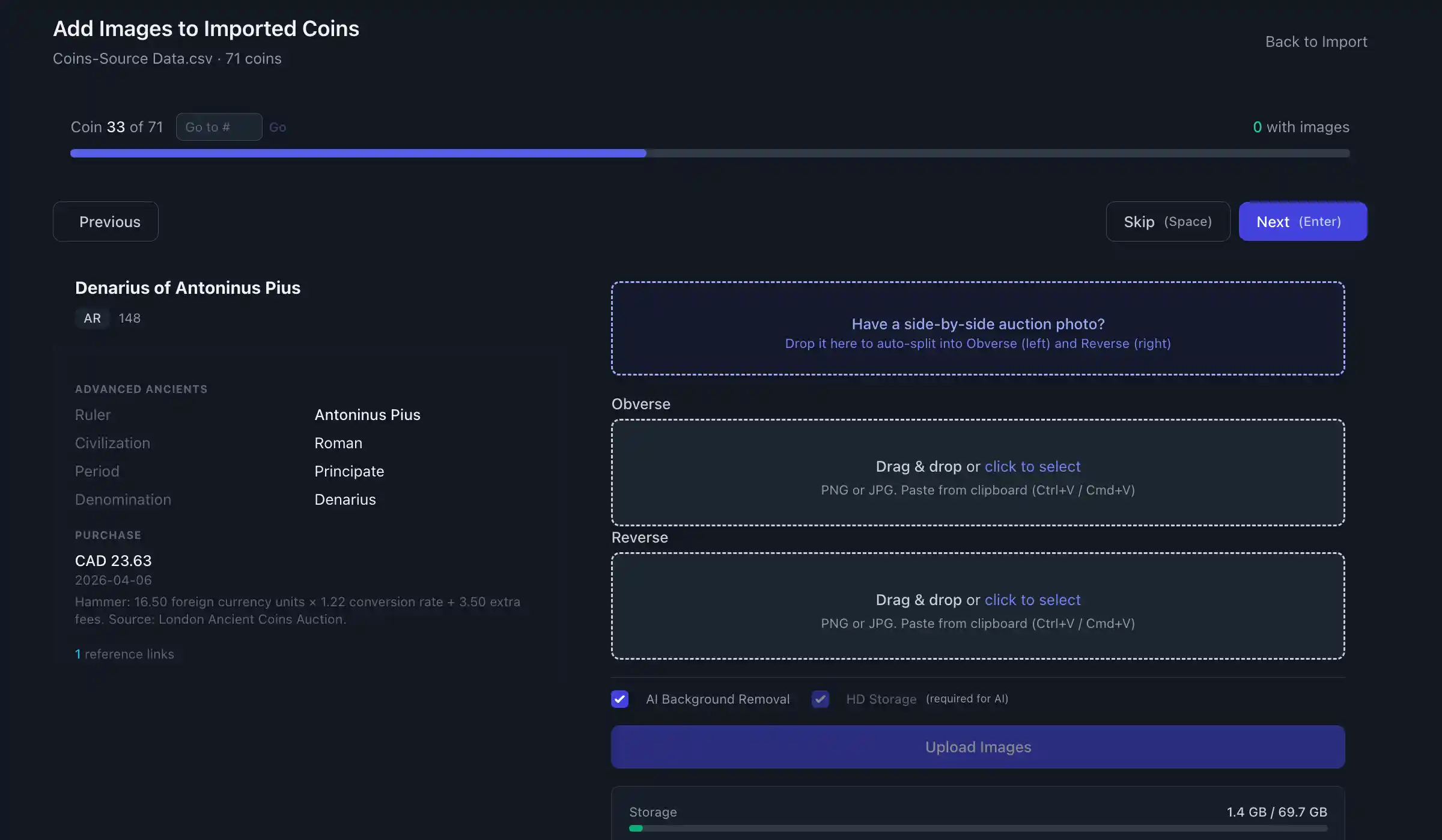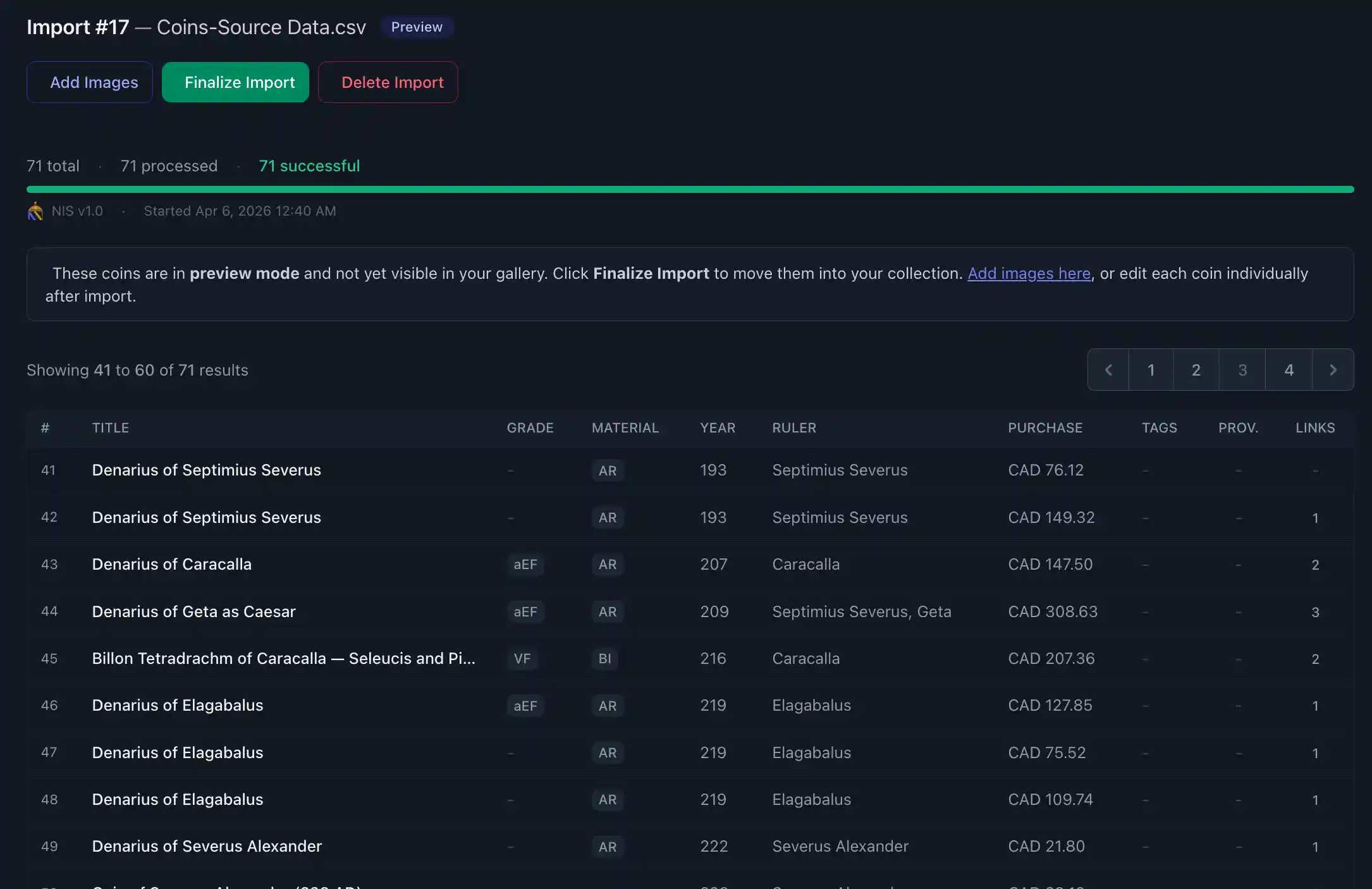 Problem Solved: Every collector has their own spreadsheet. Different columns, different headers, different ways of capturing weights, diameters, provenance, prices paid, you name it. How do you import a CSV with any possible formatting? AI. Specifically a customized version of Claude Sonnet 4.6 (high power, great at data conversion) trained to convert your CSV into a new standard I'm calling NIS (NumisVault Import Standard) which is automatically imported into your NumisVault.