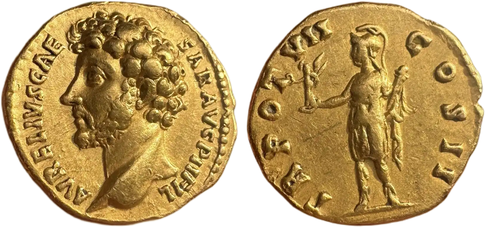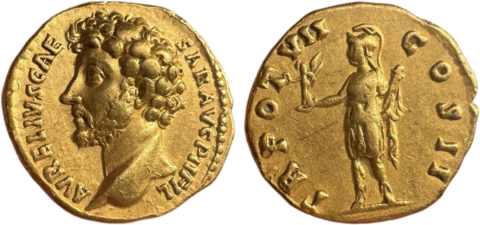Marcus Aurelius (AD 161-180) AV Aureus, Rome AD 151-152, 7.18g. Bareheaded bust of Marcus Aurelius facing left, AVRELIVS CAESAR AVG PII FIL. Rev: Roma, helmeted, in military dress, standing left, holding Victory on extended right hand and parazonium in left. TR POT VII COS II
