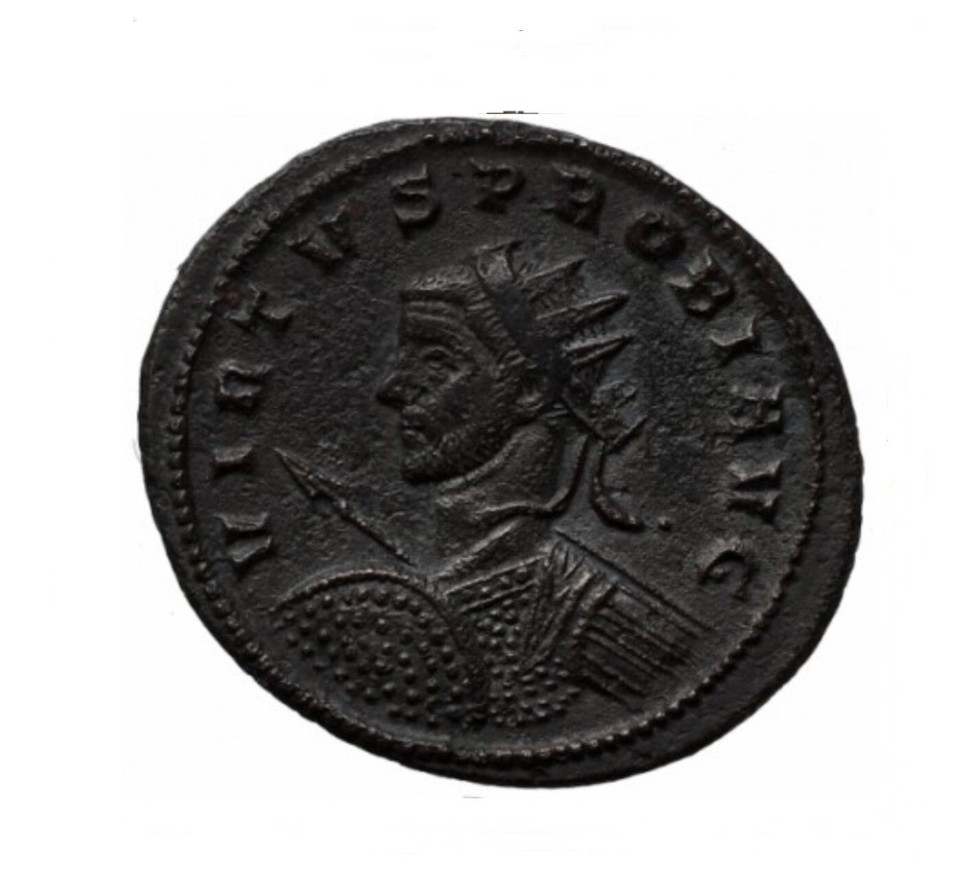 Bust type: F8 = radiate, cuirassed bust left, holding spear and shield, seen from rear
