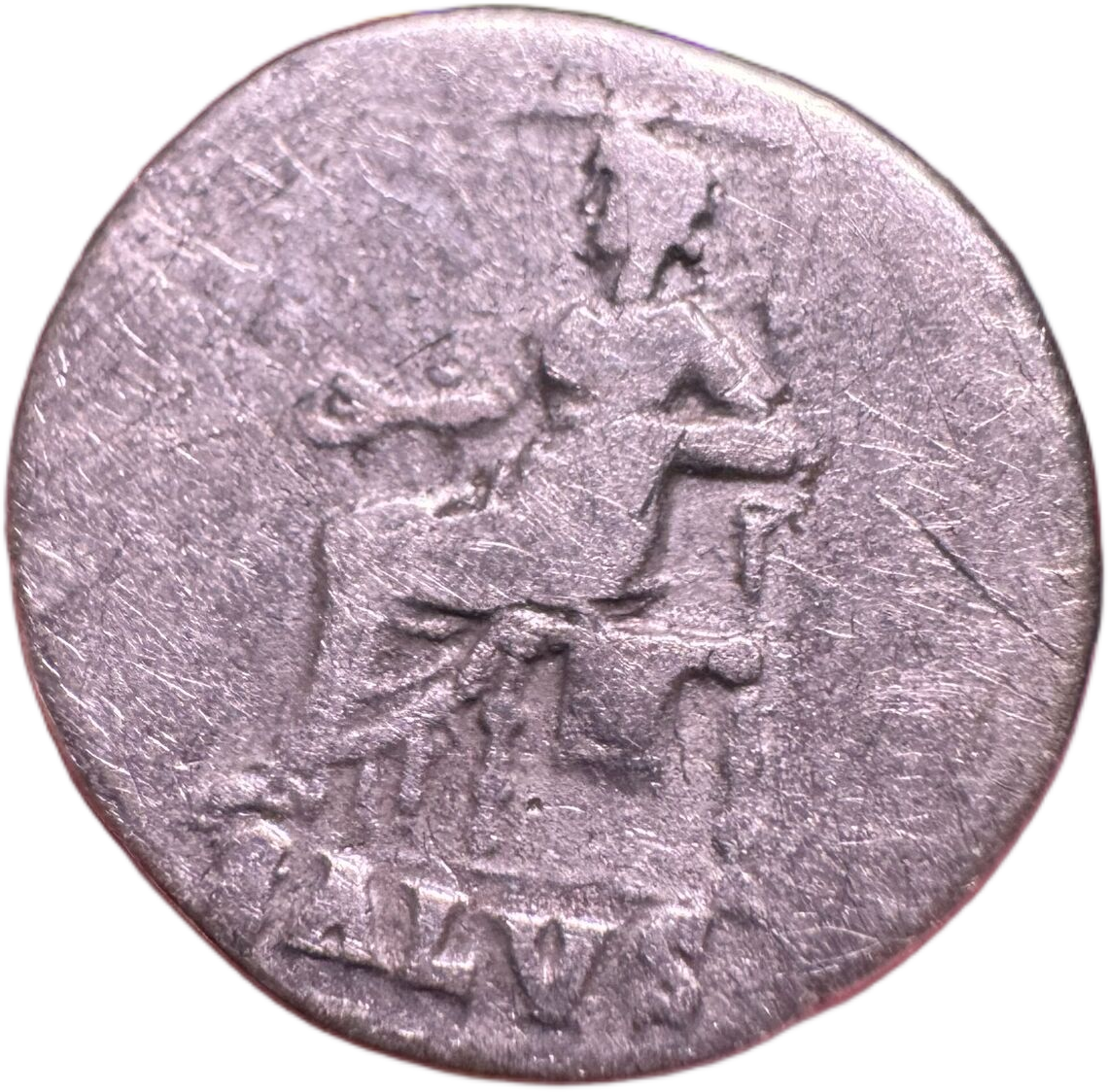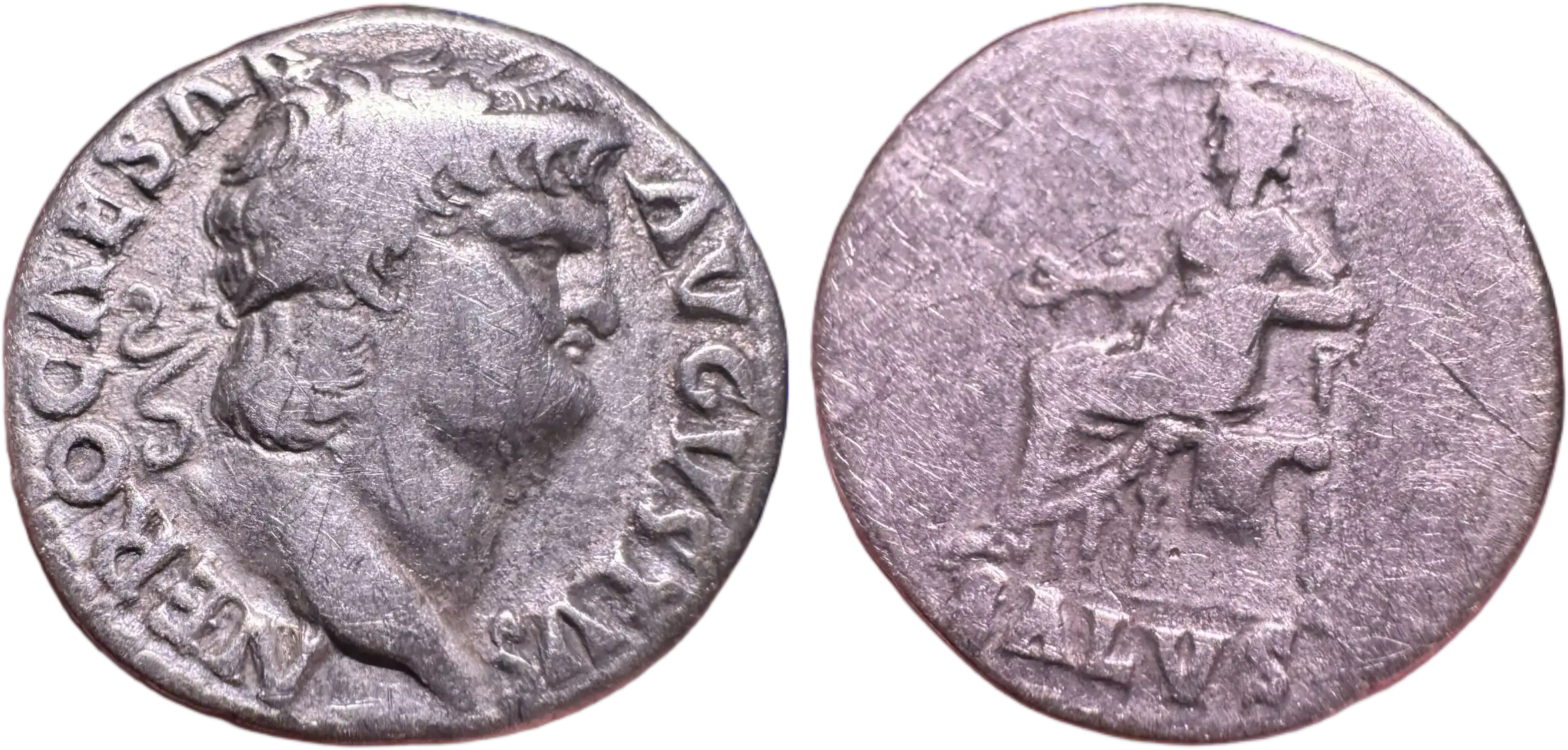 Nero, 54-68. Denarius (silver, 3.23 g, 17 mm), Rome. NERO CAESAR AVGVSTVS Laureate head right. Rev. SALVS Salus seated left on ornamented throne, holding patera. RIC II 60.
