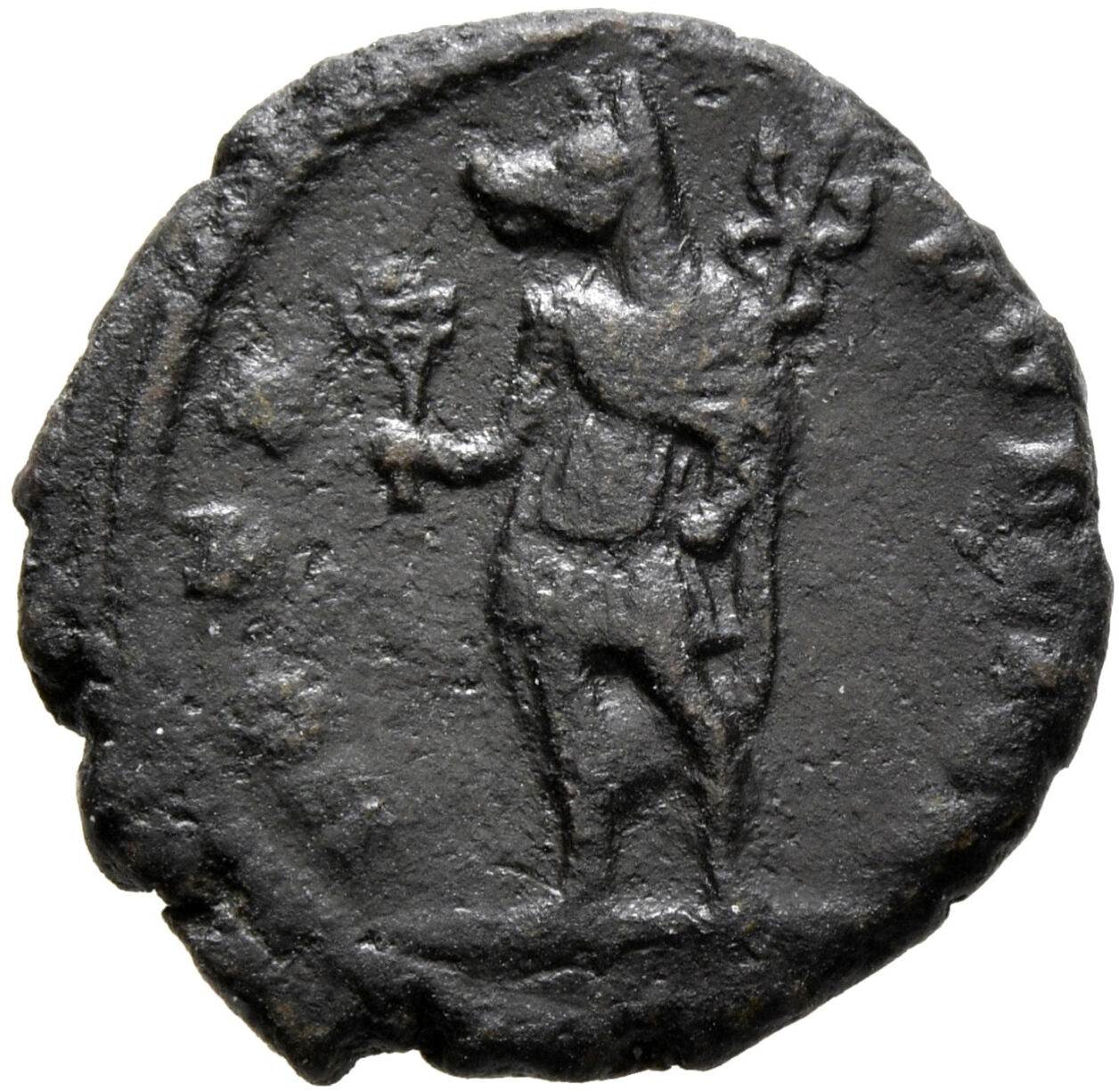 Festival of Isis. Constantius II. AD 337-361. AE (16mm, 2.73 g, 12h). Rome mint. Struck AD 352-355. D N CONSTAN-TIVS P F AVG, pearl-diademed, draped, and cuirassed bust right, seen from the front / VOTA PVBLICA, Anubis standing left, holding sistrum in right hand and caduceus in left. RIC VIII 484; Bricault & Mondello 54; Tesorillo 26/36, 608 (this token); Alföldi, Festival 54, pl. 2, 5; Vagi 3444. Extremely rare.