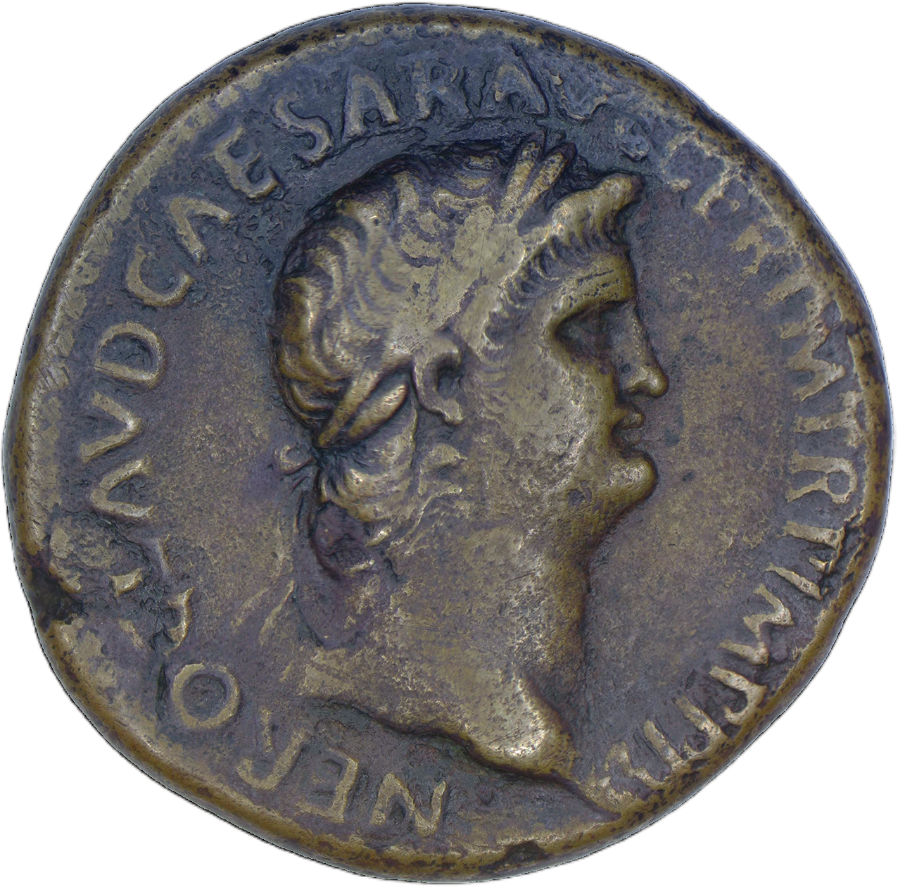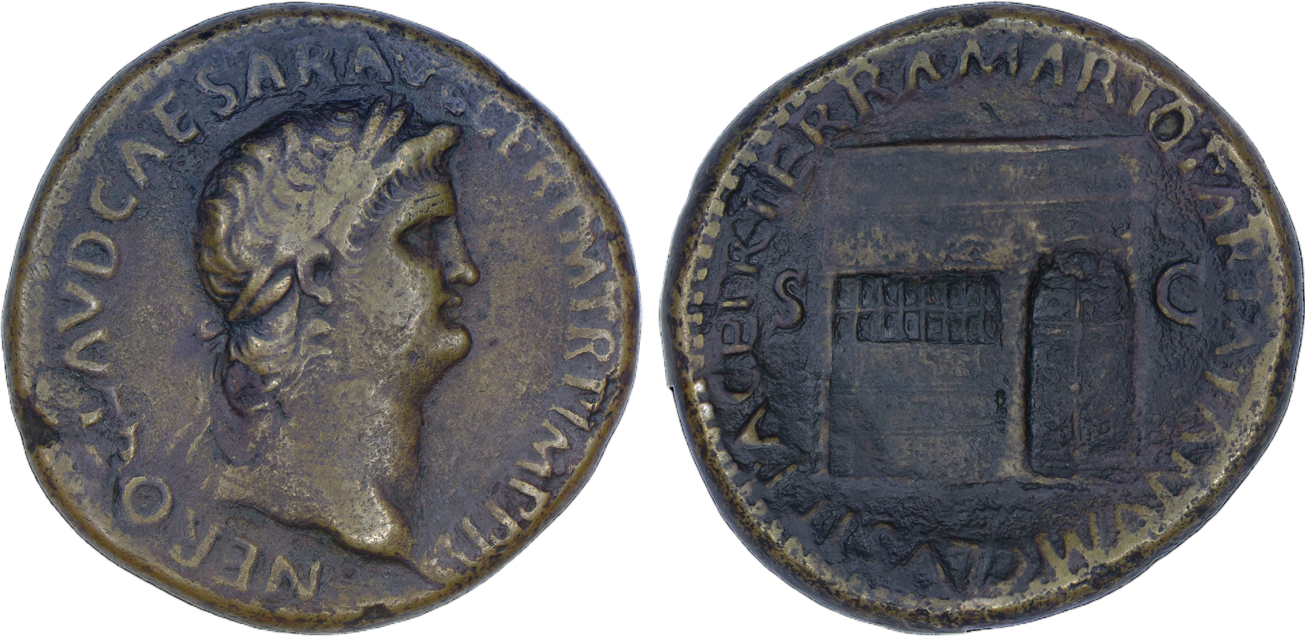 Nero. AD 54-68. Æ Sestertius (34mm, 26.88 g, 6h). Lugdunum (Lyon) mint. Struck circa AD 65. Laureate head right, globe at point of neck / Temple of Janus with latticed windows to left and garland hung across closed double doors to the right. RIC I 438; WCN 419; Lyon 109. Brown patina, minor smoothing, a couple of flan flaws. VF.