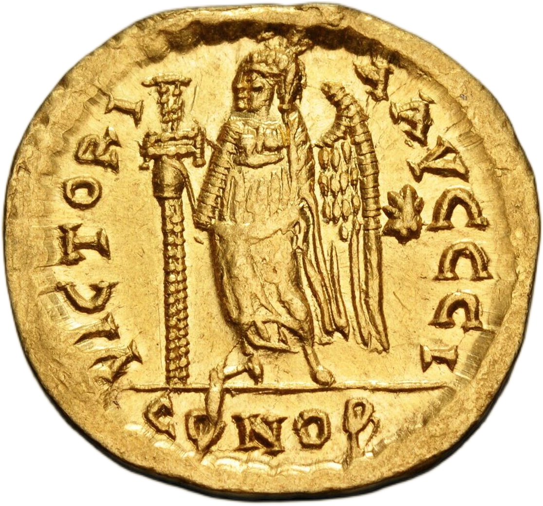 Zeno. Second reign, AD 476-491. AV Solidus (19.5mm, 4.35 g, 6h). Constantinople mint, 10th officina. Pearl-diademed, helmeted, and cuirassed bust facing slightly right, holding spear over shoulder and shield / Victory standing left, holding long cross; star to right; I//CONOB. RIC X 910 and 929; Depeyrot 108/1. Toned, a couple of reverse die breaks, clipped, a couple of attempted piercings or small marks. Good VF.