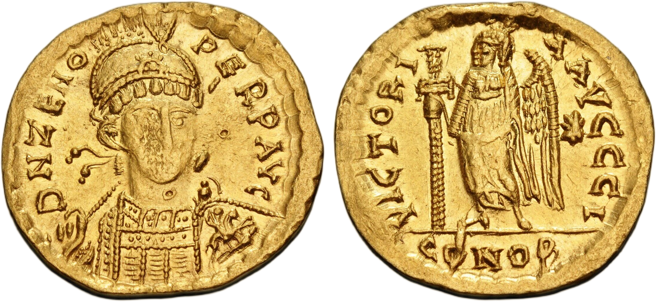 Zeno. Second reign, AD 476-491. AV Solidus (19.5mm, 4.35 g, 6h). Constantinople mint, 10th officina. Pearl-diademed, helmeted, and cuirassed bust facing slightly right, holding spear over shoulder and shield / Victory standing left, holding long cross; star to right; I//CONOB. RIC X 910 and 929; Depeyrot 108/1. Toned, a couple of reverse die breaks, clipped, a couple of attempted piercings or small marks. Good VF.
