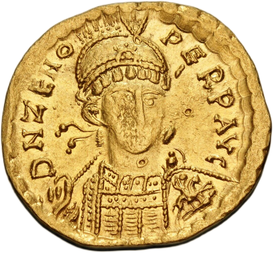 Zeno. Second reign, AD 476-491. AV Solidus (19.5mm, 4.35 g, 6h). Constantinople mint, 10th officina. Pearl-diademed, helmeted, and cuirassed bust facing slightly right, holding spear over shoulder and shield / Victory standing left, holding long cross; star to right; I//CONOB. RIC X 910 and 929; Depeyrot 108/1. Toned, a couple of reverse die breaks, clipped, a couple of attempted piercings or small marks. Good VF.
