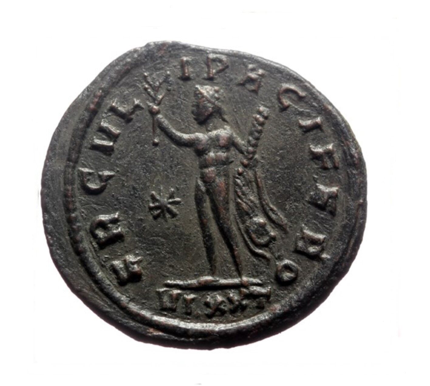 Note: A very rare shield decoration in the form of a foil. A distinctive large disc typical of Ticinum, from the third issue commemorating Probus's victorious campaign against the Germans in 277-278 AD. A very rare issue with a star in the reverse field.