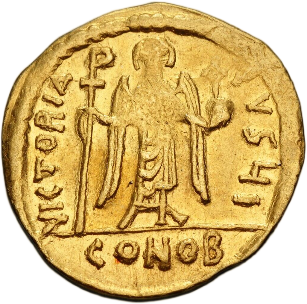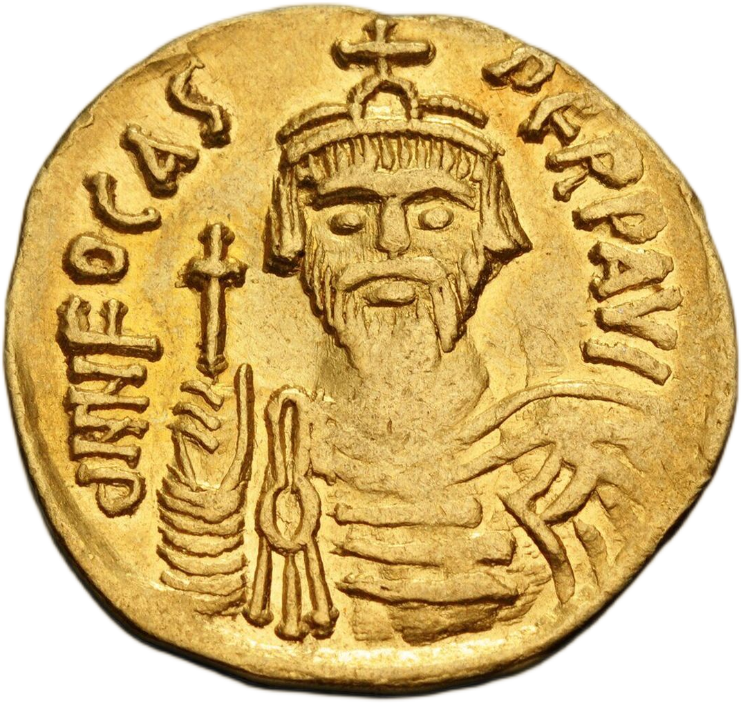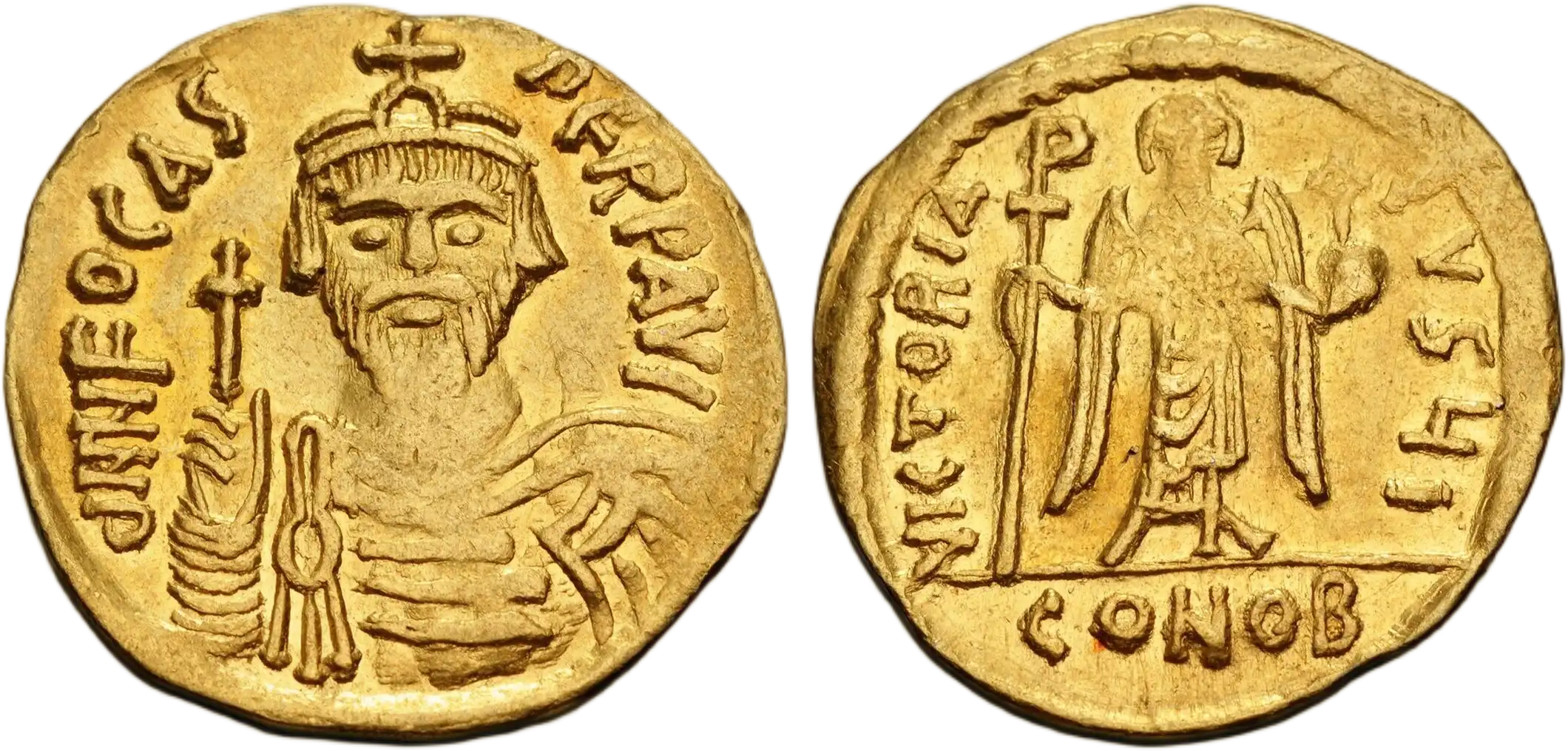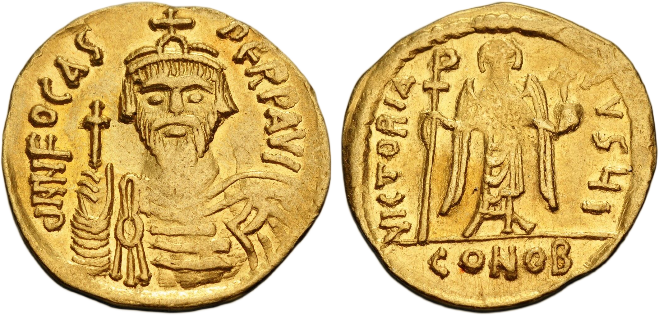 Phocas. 602-610. AV Solidus (20mm, 4.31 g, 6h). Constantinople mint, 10th officina. Struck 609-610. Crowned, draped, and cuirassed bust facing, holding globus cruciger / Angel standing facing, holding lomg staff surmounted by staurogram and globus cruciger; I//CONOB. DOC 10j.6-8; MIBE 11; SB 620. Toned, some weakness, clipped. VF.